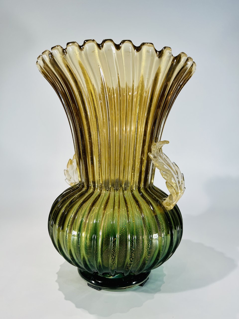Murano vaso em vidro artístico soprado de Murano desenho e produção Archimede Seguso 1950 série “Costolato oro” com aplicação.