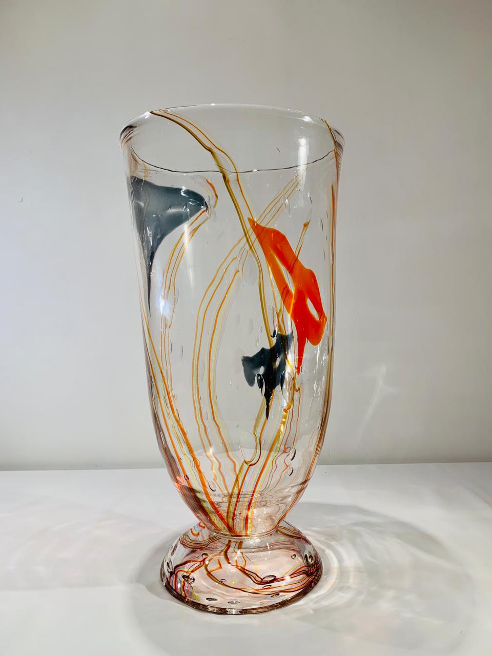 Murano ELIO RAFFAELI 1970 enorme vaso em vidro artístico soprado de Murano com filigrana e base aplicada produzido por FONTANINA. Peça única.