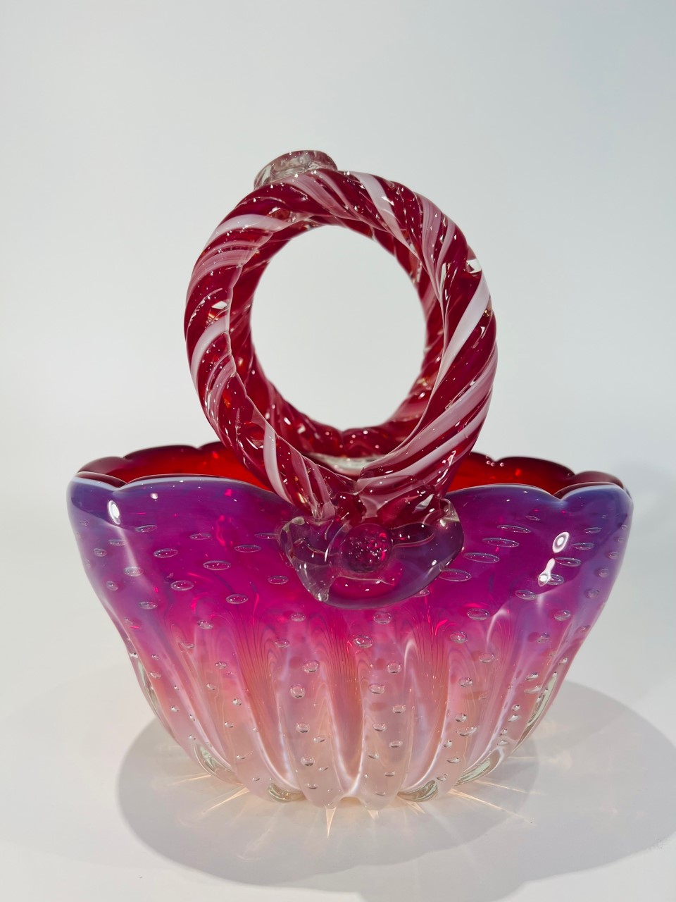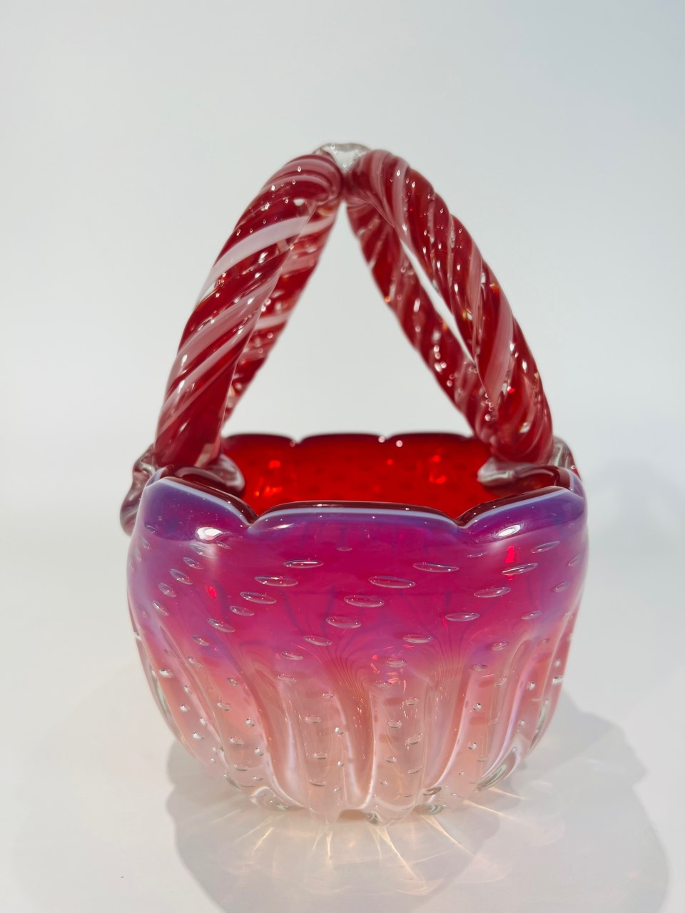 Cesta em vidro artístico soprado de Murano atribuído a CENEDESE com vidro aplicado e “bulicante”